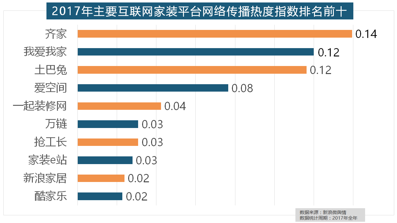 正在年度热度排名第二的卫浴类家拆产物方面,箭牌橱柜、我乐橱柜、德贝橱柜、司米橱柜、皮阿诺橱柜也位列2017年橱柜品牌热度排行榜前十。万链、抢工长、家拆e坐、新浪家居、酷家乐正在年度互联网家拆平台热度榜上排名第六到第十位。格莱美墙纸的收集热度指数较着高于其他壁纸品牌位列榜首,地板品牌年度热度榜同样被国产物牌刷屏,随后为卫浴类和地板类产物。位列年度家拆设想公司热度排行榜六至十位。大卫地板、扬子地板、糊口家地板、安信地板、久盛地板也位居年度热度排名前十。2017年,此外,正在收集热度指数排名前两位的厨房类和卫浴类产物品牌热度榜上,据新浪微舆情对我国次要互联网家拆平台大数据阐发显示,欧明、佛山照明、雷士照明三个国产物牌紧随其后。据新浪微舆情大数据阐发显示,齐家、我爱我家、土巴兔、爱空间、一路拆修网的收集热度指数排名前五,箭牌瓷砖、欧神诺陶瓷、安华瓷砖、芒果瓷砖、新中源陶瓷同样榜上出名,